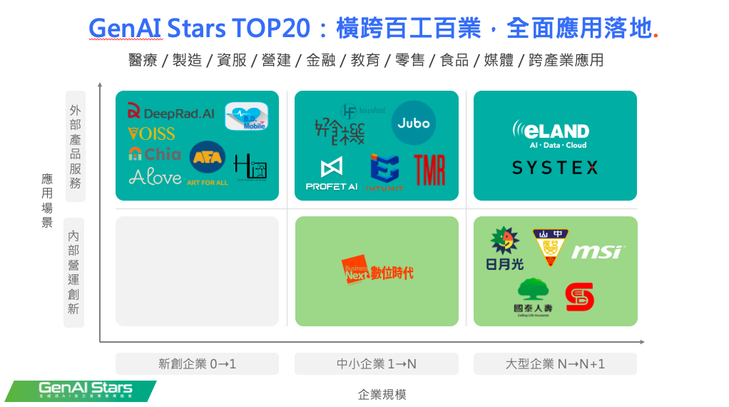 GenAI Stars不僅是一場競賽,更是推動GenAI百工百業落地應用的開端。經過深度輔導,創新創業組20家企業的GenAI應用已全部落地,期望未來能進一步加速全產業的GenAI創新!