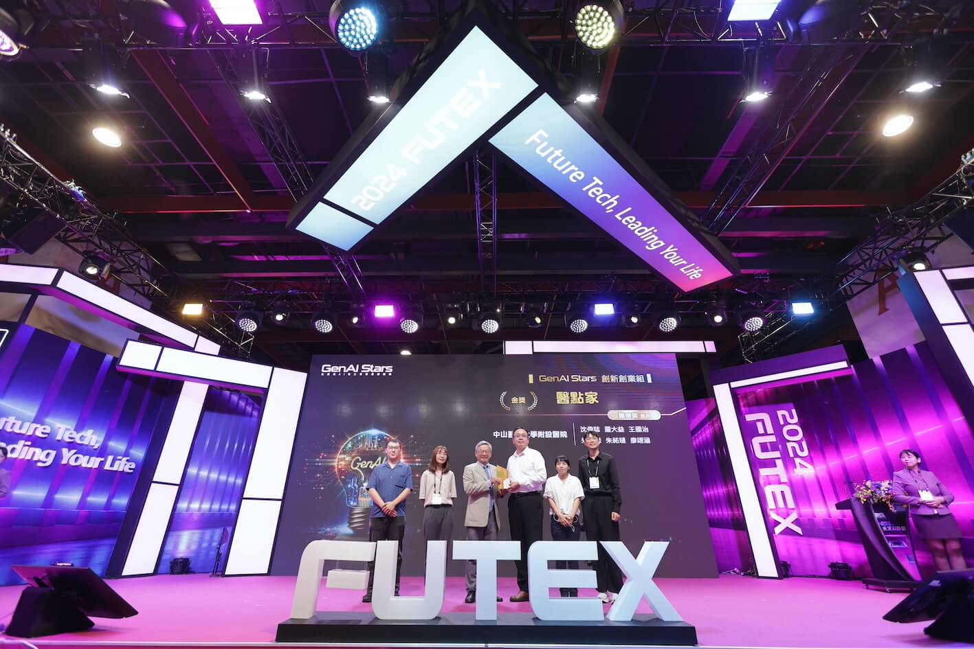 頒獎典禮頒發GenAI Stars創新創業組金、銀、銅獎,獲獎企業分別獲得150萬、100萬、50萬獎金。金獎為「中山醫學大學附設醫院」,建造雲端無代碼平台「醫點家」,無縫整合集成生成式AI、臨床資料(HIS、FHIR)以及各式檔案與訊號資料,協助醫療人員透過標準化模組自主建構臨床資料處理分析工具,減輕文件作業的負擔。